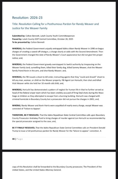 “Decision 2026-23 requires a posthumous pardon of Randy Weaver and for homicide costs to be introduced towards Lon Horiuchi, the FBI sniper who shot and killed Vicki Weaver in the course of the Ruby Ridge standoff in 1992,” Gem State Chronicle notes in its Jan. 10 report on the  Idaho GOP State Central Committee’s “Winter Assembly 2026.”